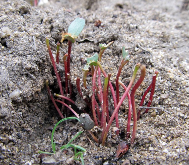 A cluster of antelope bitterbrush seedlings that has been browsed. “Succulent, young seedlings are thought to be important in the diets of rodents during early spring because of the nutrients and water they contain.” — Vander Wall (1994)