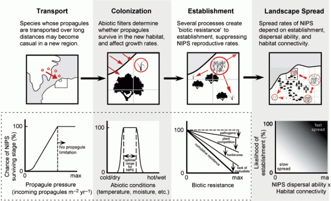 Weed risk assessment models are used to quickly determine the potential of a plant species to become invasive by asking a series of questions about the plant’s attributes and life history traits, as well as its native climate and geography. A plant species can be accepted, rejected, or require further evaluation depending on how the questions are answered. For example, if a plant is known to be invasive elsewhere and/or if it displays traits commonly found in other invasive species, it receives a high score and is either rejected or evaluated further. Such models offer a quick and affordable way to weed out incoming invasives; however, they are not likely to spot every potential invasive species, and they may also lead to the rejection of species that ultimately would not have become invasive.