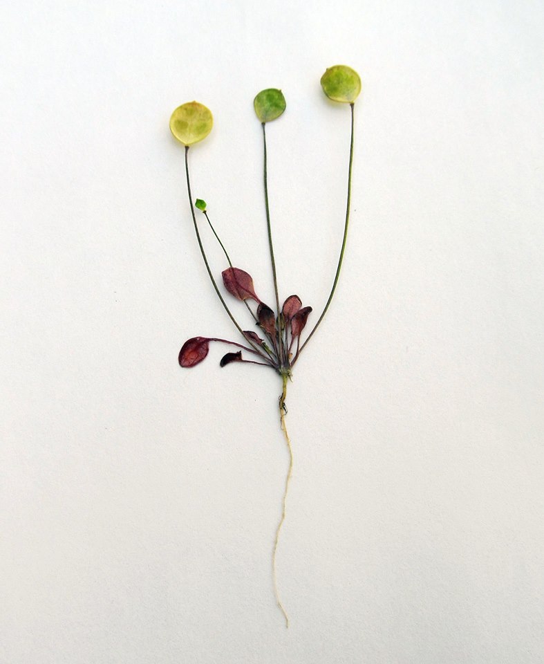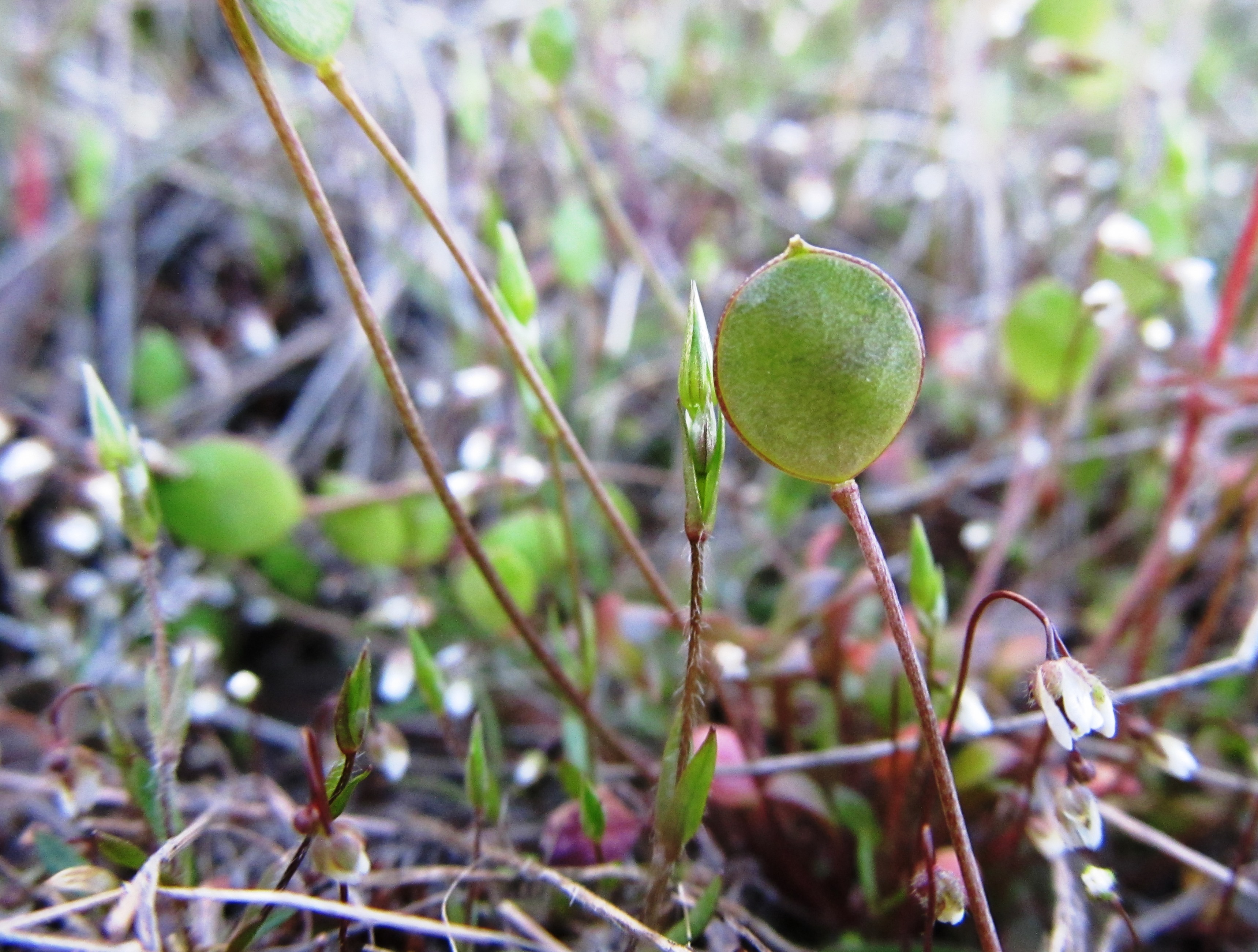 Idahoa scapigera is truly tiny. Before it flowers, it forms a basal rosette of leaves that max out at about 3 centimeters long. Next it sends up several skinny flower stalks that reach maybe 10 centimeters high (some are much shorter). One single flower is born atop each stalk. Its petite petals are white and are cupped by red to purple sepals. Its fruit is a flat round or oblong disk held vertically as though it is ready to give neighboring fruits a high five. Happening upon a patch of these plants in fruit is a real joy.