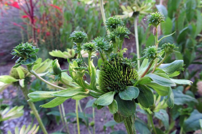 Genetic mutations are one way that odd looking flowers come about. It is not the cause, however, of the freak flowers that I recently came across. What I witnessed was something called phyllody and was the result of an infection most likely introduced to the plant by a leafhopper or some other sap-sucking insect. Phyllody, which has a variety of causes, is a disruption in plant hormones that leads to leaves growing in place of flower parts. As a result, the flowers become sterile and green in color. In the case of purple coneflower, leafy structures are produced atop shoots arising from the middle of ray and/or disc florets. In other species, shoots aren’t visible and instead the inflorescence is just a cluster of leaves. In a sense, the reproductive shoot has returned to indeterminate growth, having switched back to shoot and leaf production.